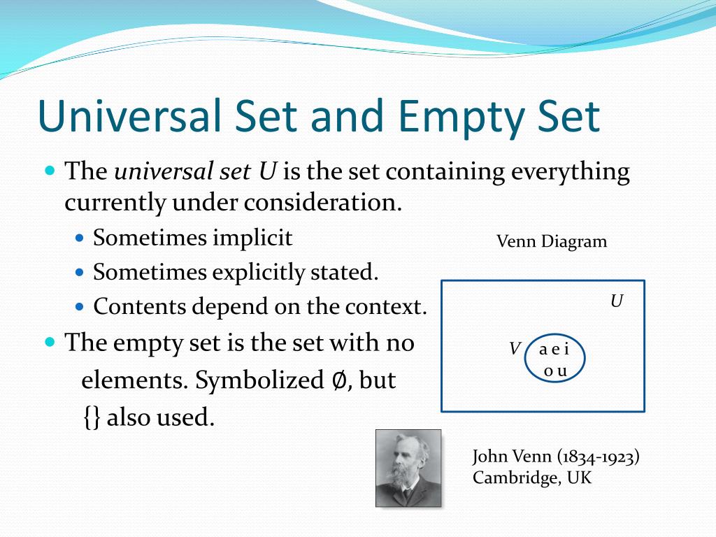 Universal Set and Empty Set • The universal setU is the set containing everything currently under consideration. • Sometimes implicit • Sometimes explicitly stated. • Contents depend on the context. • The empty set is the set with no elements. Symbolized ∅, but {} also used. Venn Diagram U V a e i o u John Venn (1834-1923) Cambridge, UK