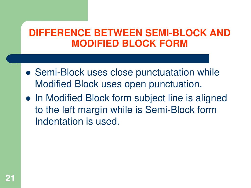 DIFFERENCE BETWEEN SEMI-BLOCK AND MODIFIED BLOCK FORM • Semi-Block uses close punctuatation while Modified Block uses open punctuation. • In Modified Block form subject line is aligned to the left margin while is Semi-Block form Indentation is used.