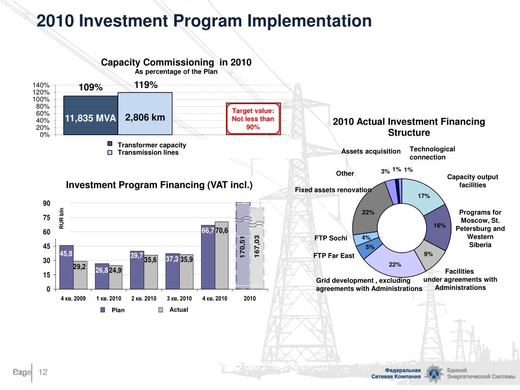 2010 Investment Program Implementation Target value: Not less than 90% 2,806 km 11,835 MVA Transformer capacity Transmission lines Investment Program Financing (VAT incl.) RUR bln Actual Plan