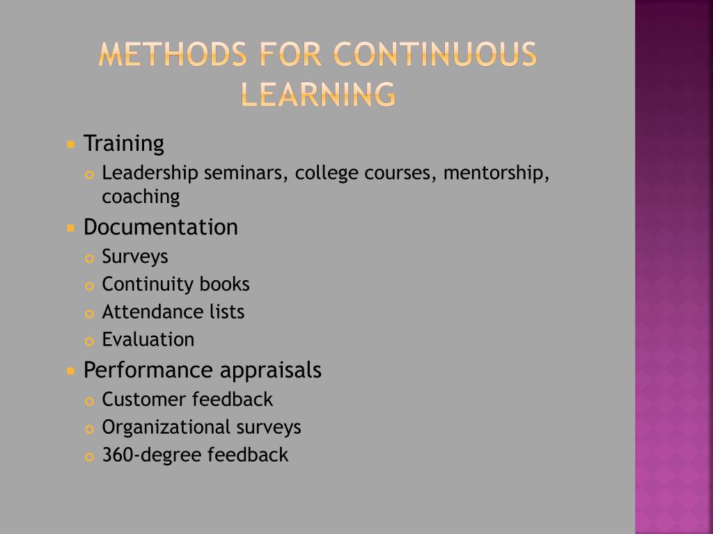 METHODS FOR CONTINUOUS LEARNING • Training • Leadership seminars, college courses, mentorship, coaching • Documentation • Surveys • Continuity books • Attendance lists • Evaluation • Performance appraisals • Customer feedback • Organizational surveys • 360-degree feedback