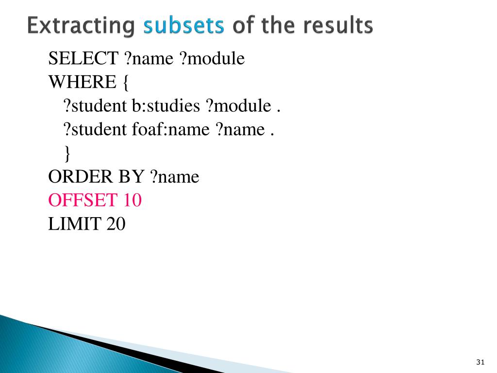 Extracting subsets of the results SELECT ?name ?module WHERE { ?student b:studies ?module . ?student foaf:name ?name . } ORDER BY ?name OFFSET 10 LIMIT 20