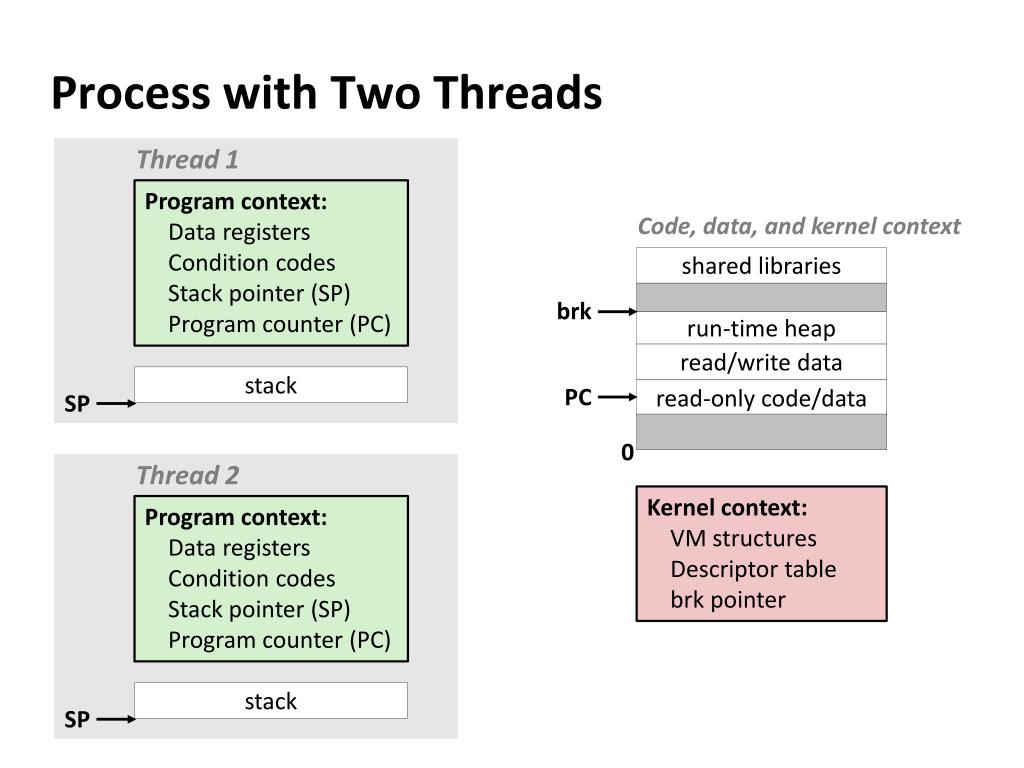 Process with Two Threads Thread 1 Program context: Data registers Condition codes Stack pointer (SP) Program counter (PC) Code, data, and kernel context shared libraries brk run-time heap read/write data stack PC read-only code/data SP 0 Thread 2 Kernel context: VM structures Descriptor table brk pointer Program context: Data registers Condition codes Stack pointer (SP) Program counter (PC) stack SP