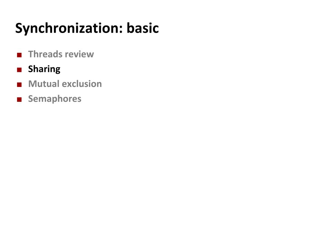 Synchronization: basic • Threads review • Sharing • Mutual exclusion • Semaphores