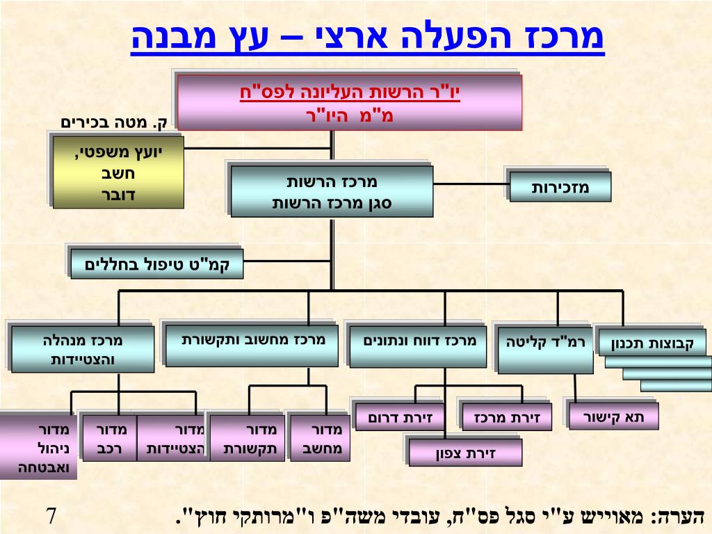 מרכז הפעלה ארצי – עץ מבנה יו"ר הרשות העליונה לפס"חמ"מ היו"ר ק. מטה בכירים יועץ משפטי, חשבדובר מרכז הרשותסגן מרכז הרשות מזכירות קמ"ט טיפול בחללים מרכז מחשוב ותקשורת מרכז מנהלה והצטיידות מרכז דווח ונתונים רמ"ד קליטה קבוצות תכנון תא קישור זירת דרום זירת מרכז מדורניהול ואבטחה מדוררכב מדור הצטיידות מדורתקשורת מדור מחשב זירת צפון 7 הערה: מאוייש ע"י סגל פס"ח, עובדי משה"פ ו"מרותקי חוץ".