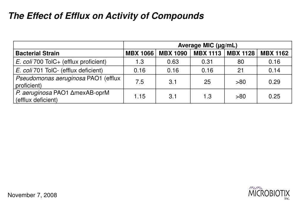 Bottom line • Analyses of MBX-1090 resistant mutants have not identified MOA • MBX-1090 resistant mutants have identified a novel mechanism of resistance based on drug efflux • Resistance mechanism does not affect MBX-1066 and analogs • Additional experiments in progress to elucidate MOA….