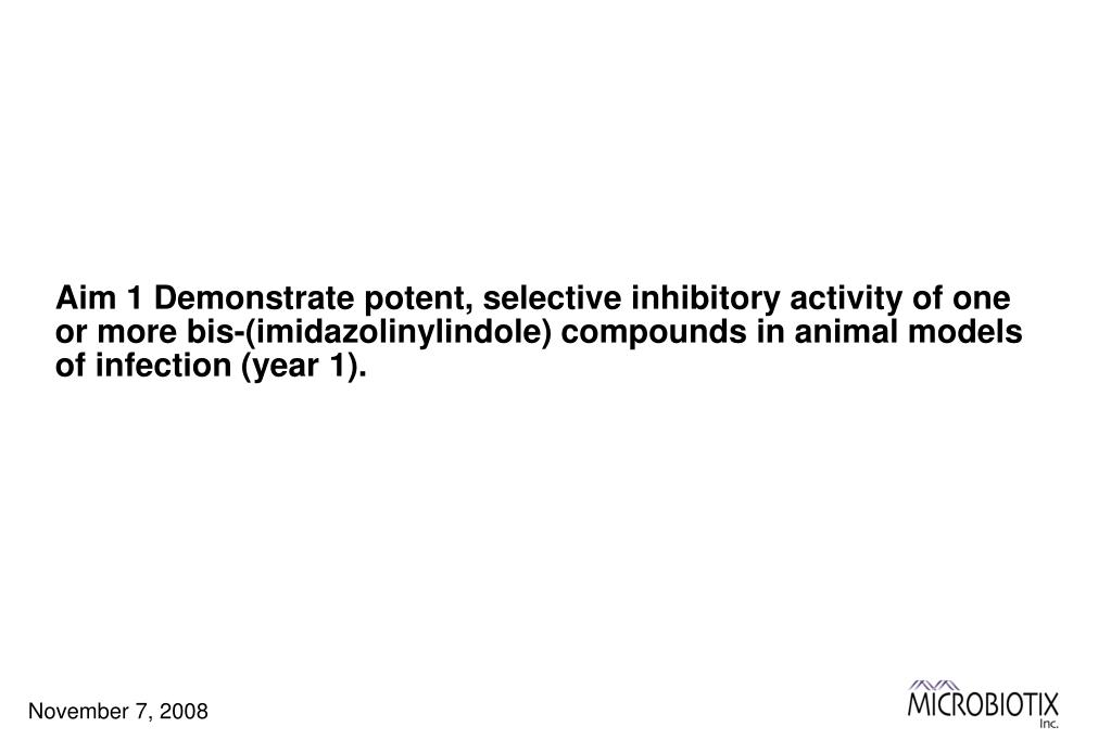 Aim 1 Demonstrate potent, selective inhibitory activity of one or more bis-(imidazolinylindole) compounds in animal models of infection (year 1).