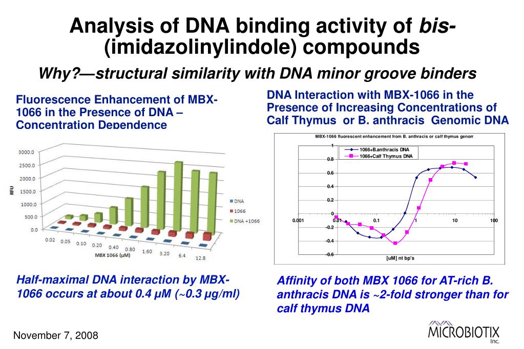 Analysis of DNA binding activity of bis-(imidazolinylindole) compounds Why?—structural similarity with DNA minor groove binders DNA Interaction with MBX-1066 in the Presence of Increasing Concentrations of Calf Thymus or B. anthracis Genomic DNA Fluorescence Enhancement of MBX-1066 in the Presence of DNA – Concentration Dependence Half-maximal DNA interaction by MBX-1066 occurs at about 0.4 μM (~0.3 μg/ml) Affinity of both MBX 1066 for AT-rich B. anthracis DNA is ~2-fold stronger than for calf thymus DNA