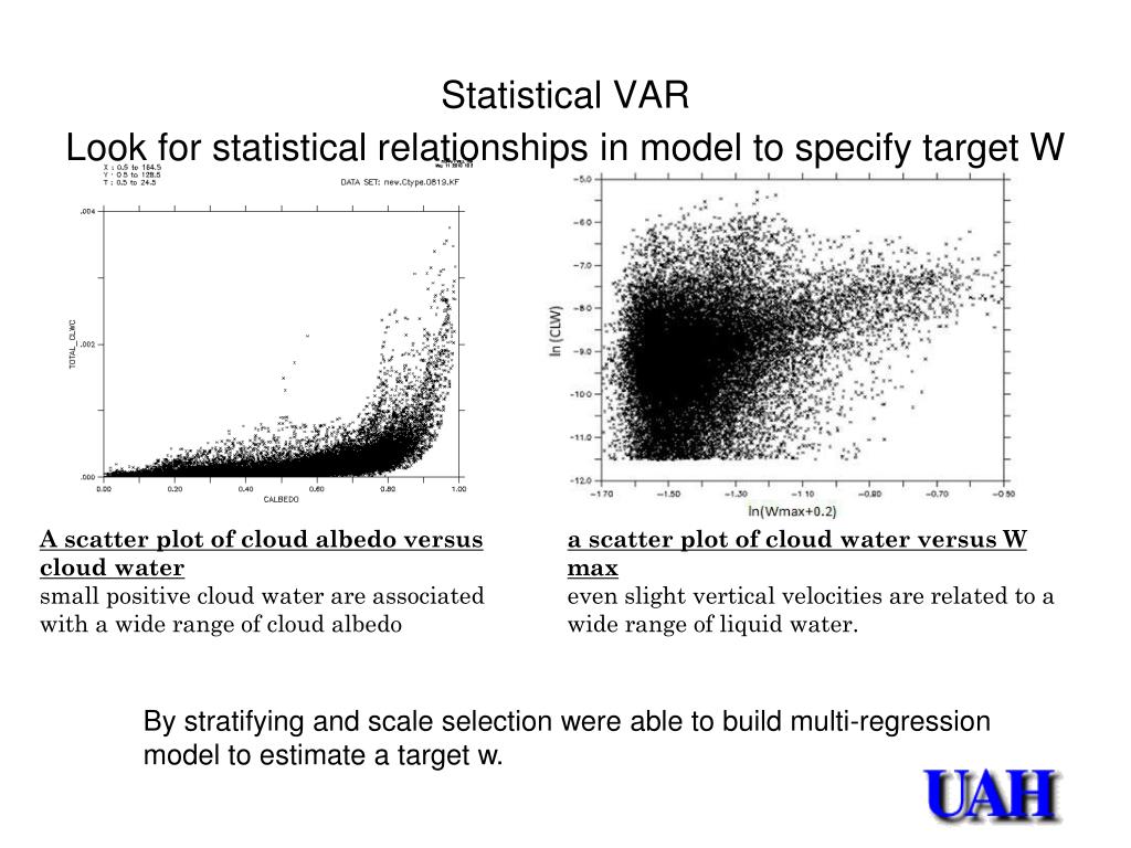 Statistical VARLook for statistical relationships in model to specify target W A scatter plot of cloud albedo versus cloud water small positive cloud water are associated with a wide range of cloud albedo a scatter plot of cloud water versus W max even slight vertical velocities are related to a wide range of liquid water. By stratifying and scale selection were able to build multi-regression model to estimate a target w.