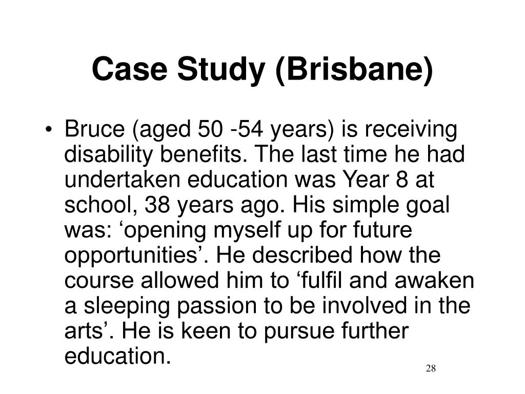 Case Study (Brisbane) • Bruce (aged 50 -54 years) is receiving disability benefits. The last time he had undertaken education was Year 8 at school, 38 years ago. His simple goal was: ‘opening myself up for future opportunities’. He described how the course allowed him to ‘fulfil and awaken a sleeping passion to be involved in the arts’. He is keen to pursue further education.