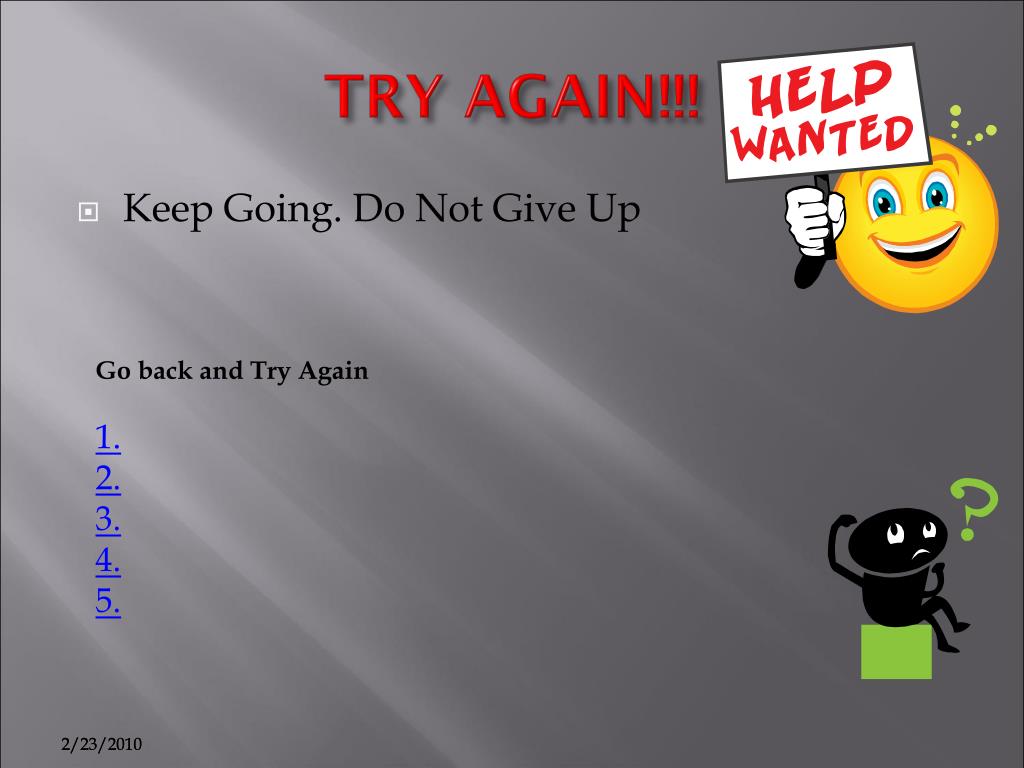TRY AGAIN!!! Go back and Try Again 1. 2. 3. 4. 5. 2/23/2010 • Keep Going. Do Not Give Up