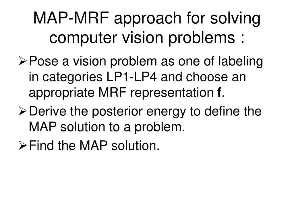 MAP-MRF approach for solving computer vision problems : • Pose a vision problem as one of labeling in categories LP1-LP4 and choose an appropriate MRF representation f. • Derive the posterior energy to define the MAP solution to a problem. • Find the MAP solution.