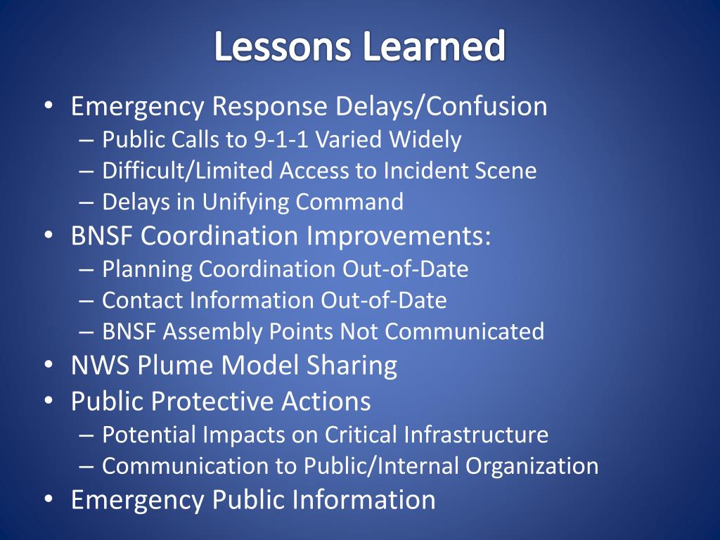 Lessons Learned • Emergency Response Delays/Confusion • Public Calls to 9-1-1 Varied Widely • Difficult/Limited Access to Incident Scene • Delays in Unifying Command • BNSF Coordination Improvements: • Planning Coordination Out-of-Date • Contact Information Out-of-Date • BNSF Assembly Points Not Communicated • NWS Plume Model Sharing • Public Protective Actions • Potential Impacts on Critical Infrastructure • Communication to Public/Internal Organization • Emergency Public Information