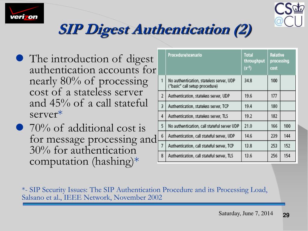 SIP Digest Authentication (2) • The introduction of digest authentication accounts for nearly 80% of processing cost of a stateless server and 45% of a call stateful server* • 70% of additional cost is for message processing and 30% for authentication computation (hashing)* *- SIP Security Issues: The SIP Authentication Procedure and its Processing Load, Salsano et al., IEEE Network, November 2002