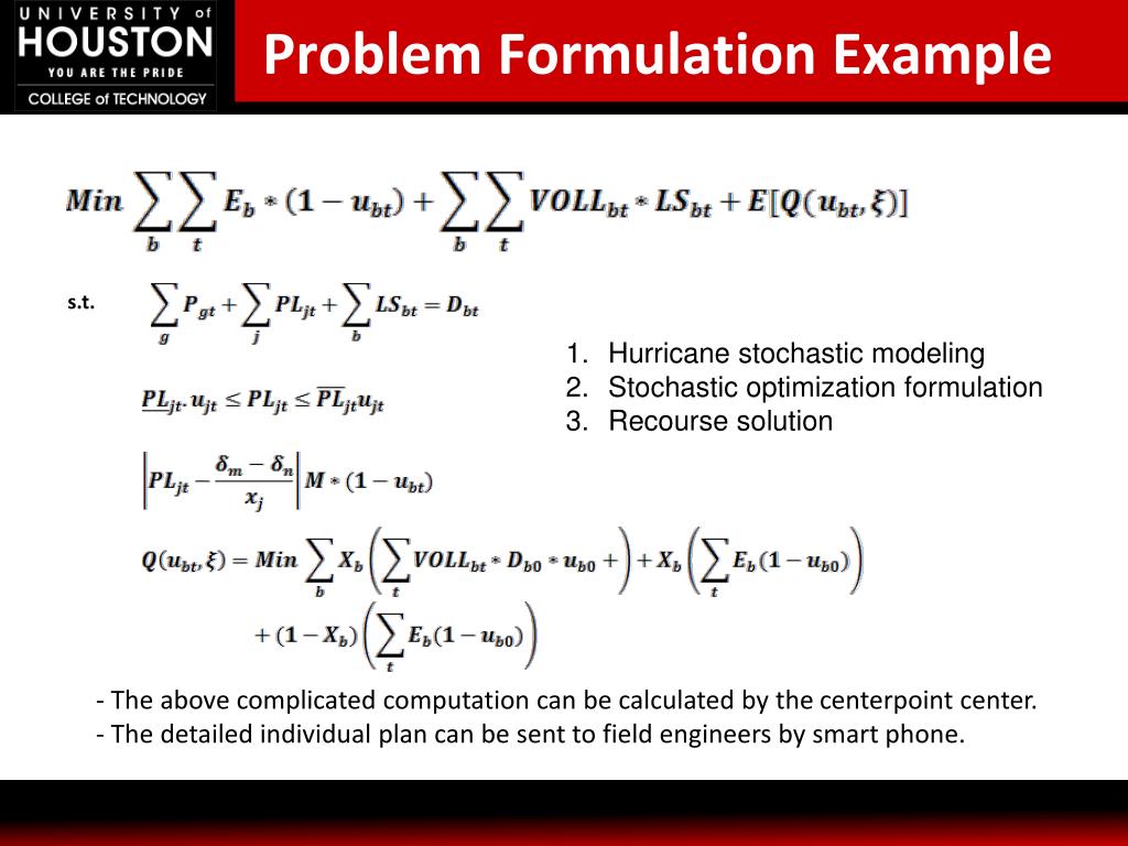 Problem Formulation Example s.t. • Hurricane stochastic modeling • Stochastic optimization formulation • Recourse solution - The above complicated computation can be calculated by the centerpoint center. - The detailed individual plan can be sent to field engineers by smart phone.