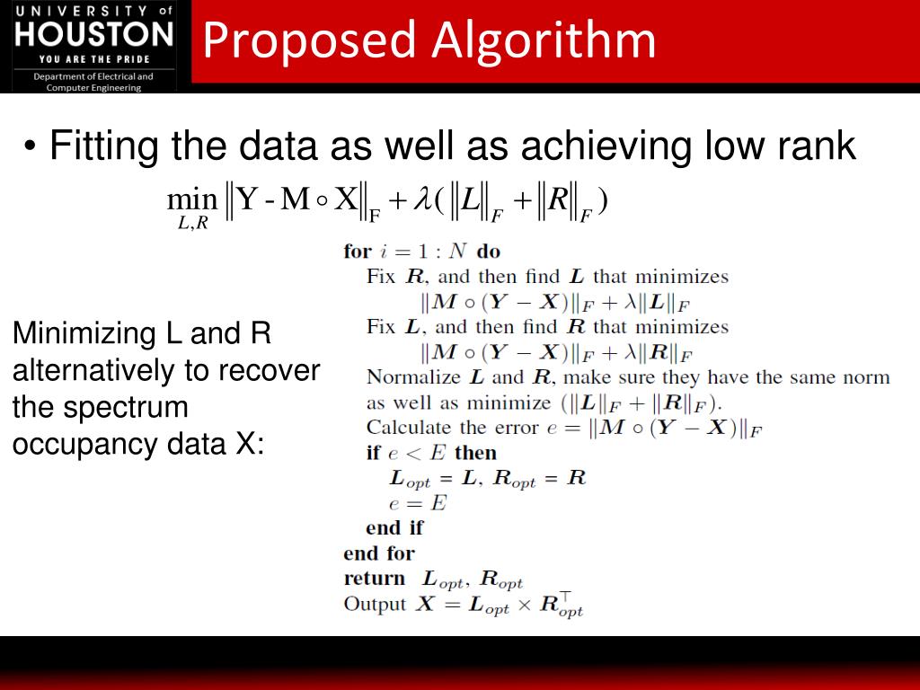 Proposed Algorithm • Fitting the data as well as achieving low rank Minimizing L and R alternatively to recover the spectrum occupancy data X: