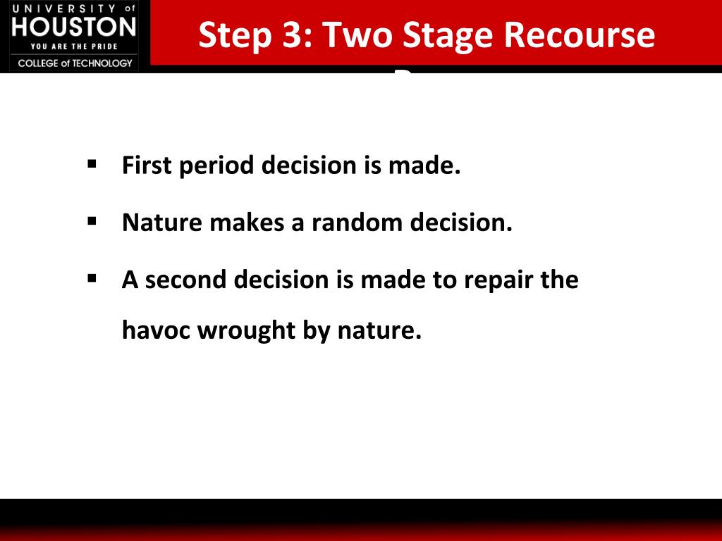 Step 3: Two Stage Recourse Program • First period decision is made. • Nature makes a random decision. • A second decision is made to repair the havoc wrought by nature.
