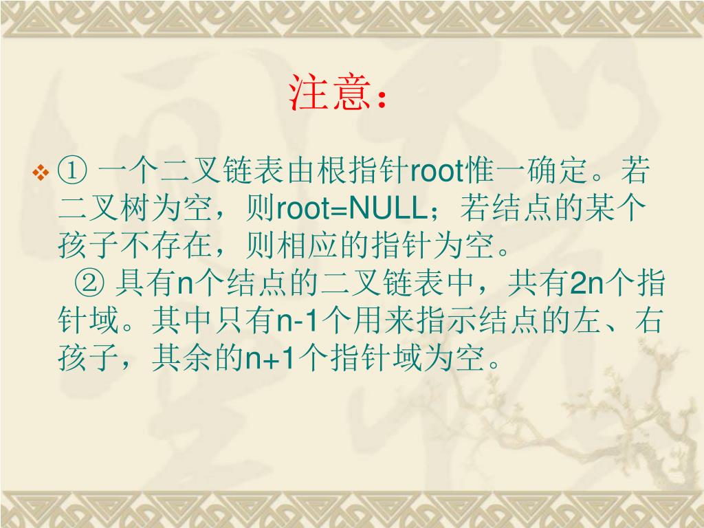 注意: • ① 一个二叉链表由根指针root惟一确定。若二叉树为空,则root=NULL;若结点的某个孩子不存在,则相应的指针为空。 ② 具有n个结点的二叉链表中,共有2n个指针域。其中只有n-1个用来指示结点的左、右孩子,其余的n+1个指针域为空。