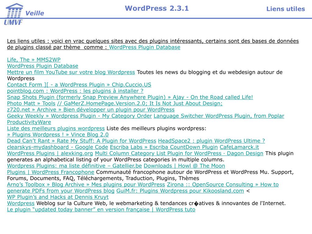 WordPress 2.3.1 Intérêt pour l’UMVF Veille Les points forts de Wordpress : Wordpress est l’outil idéal pour réaliser un site qui doit traiter d’une actualité. Soit pour informer de manière régulière des étudiants, soit carrément pour réaliser une revue scientifique et publier des articles. De véritables magazines en ligne existent sur cette base. Il est également une solution simple et rapide pour publier des contenus. On parle alors d’un détournement de l’outil de blogging pour l’utiliser comme un CMS (content management system). En effet, Wordpress permet de développer des catégories et des pages statiques, autant d’outils pour réaliser une véritable arborescence et donc un véritable site web. De nombreux sites sont aujourd’hui conçus de cette manière. La dissociation par la gestion de CSS du contenu et de la forme, permet de modifier profondément l’apparence du site en quelques clics. La gestion de plusieurs niveaux de droits d’écriture permet de distribuer des rôles aux contributeurs voire aux lecteurs. La gestion de flux RSS est intégrée à Wordpress, cela permet l’indexation sur un agrégateur des nouveautés de votre blog. Par exemple, un usager de netvibes, ou de outlook 2007 (qui possède un intégrateur RSS) n’aura pas besoin d’aller sur votre blog, il sera abonné et directement averti d’une nouvelle publication avec aperçu du titre des nouveaux articles. Wordpress propose également une véritable plateforme de génération de blogs avec le produit Wordpress µ. Vous pouvez alors mettre en place un outil communautaire permettant à chacun d’avoir son blog.