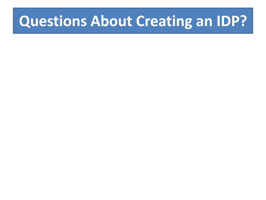 Annual IDP Progress • Subsequent years • Revise/update and add new goals to your annual and 5 year plans • Share with mentors