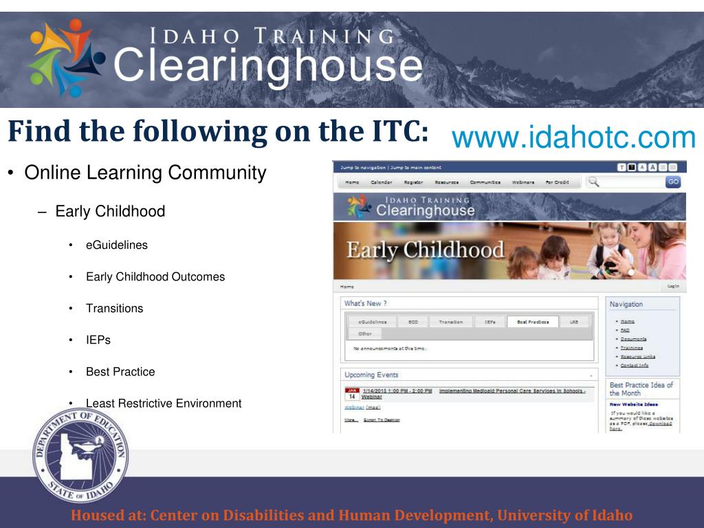 www.idahotc.com Find the following on the ITC: Online Learning Community Early Childhood eGuidelines Early Childhood Outcomes Transitions IEPs Best Practice Least Restrictive Environment Housed at: Center on Disabilities and Human Development, University of Idaho