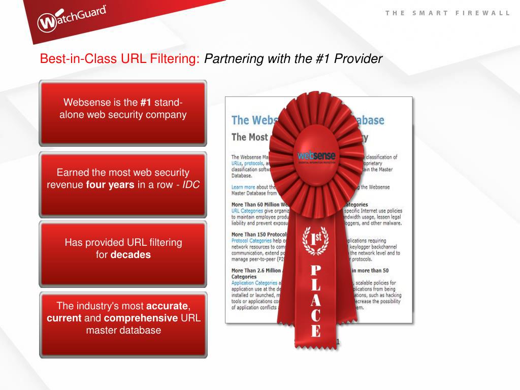 Best-in-Class URL Filtering: Partnering with the #1 Provider Websense is the #1 stand-alone web security company Earned the most web security revenue four years in a row - IDC Has provided URL filtering for decades The industry's most accurate, current and comprehensive URL master database