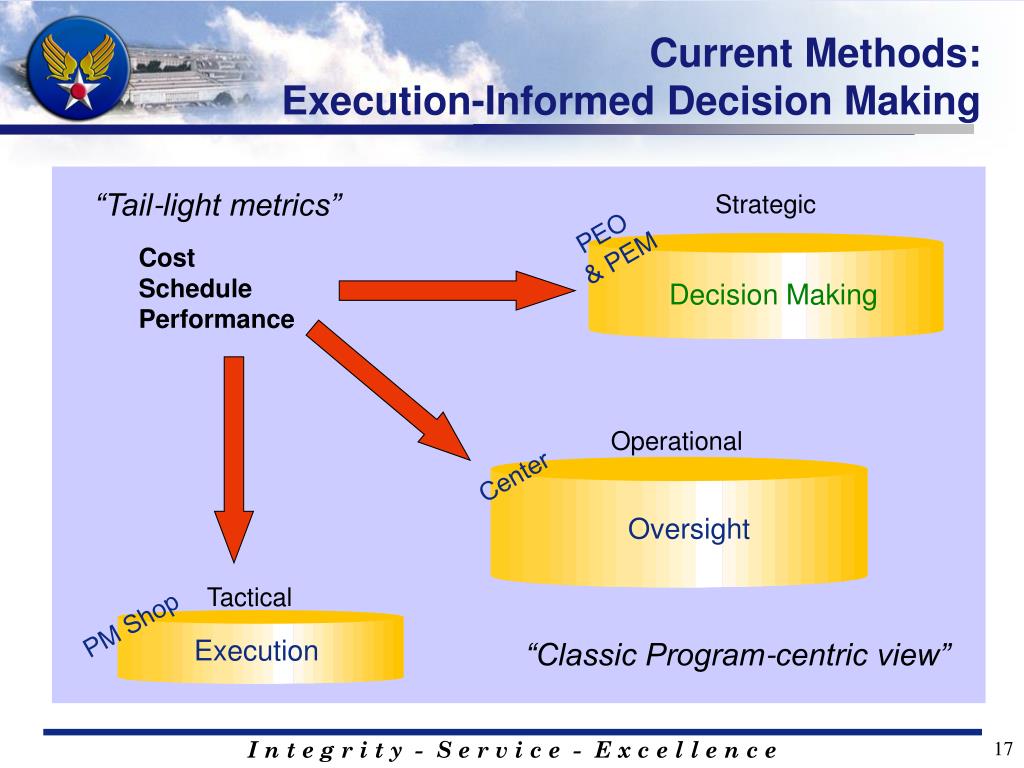 Current Methods:Execution-Informed Decision Making “Tail-light metrics” Strategic PEO & PEM Cost Schedule Performance Decision Making Operational Center Oversight Tactical PM Shop Execution “Classic Program-centric view”