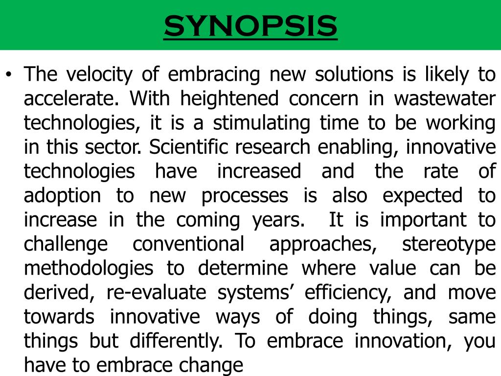SYNOPSIS • The velocity of embracing new solutions is likely to accelerate. With heightened concern in wastewater technologies, it is a stimulating time to be working in this sector. Scientific research enabling, innovative technologies have increased and the rate of adoption to new processes is also expected to increase in the coming years. It is important to challenge conventional approaches, stereotype methodologies to determine where value can be derived, re-evaluate systems’ efficiency, and move towards innovative ways of doing things, same things but differently. To embrace innovation, you have to embrace change