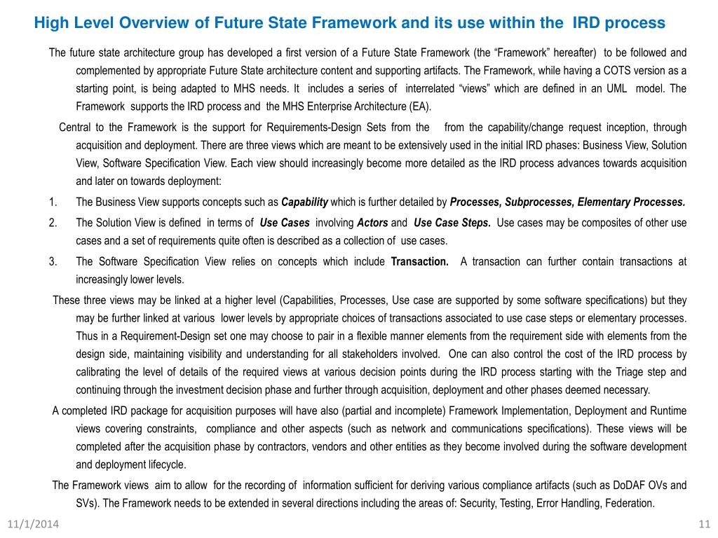 High Level Overview of Future State Framework and its use within the IRD process The future state architecture group has developed a first version of a Future State Framework (the “Framework” hereafter) to be followed and complemented by appropriate Future State architecture content and supporting artifacts. The Framework, while having a COTS version as a starting point, is being adapted to MHS needs. It includes a series of interrelated “views” which are defined in an UML model. The Framework supports the IRD process and the MHS Enterprise Architecture (EA). Central to the Framework is the support for Requirements-Design Sets from the from the capability/change request inception, through acquisition and deployment. There are three views which are meant to be extensively used in the initial IRD phases: Business View, Solution View, Software Specification View. Each view should increasingly become more detailed as the IRD process advances towards acquisition and later on towards deployment: • The Business View supports concepts such as Capability which is further detailed by Processes, Subprocesses, Elementary Processes. • The Solution View is defined in terms of Use Cases involving Actors and Use Case Steps. Use cases may be composites of other use cases and a set of requirements quite often is described as a collection of use cases. • The Software Specification View relies on concepts which include Transaction. A transaction can further contain transactions at increasingly lower levels. These three views may be linked at a higher level (Capabilities, Processes, Use case are supported by some software specifications) but they may be further linked at various lower levels by appropriate choices of transactions associated to use case steps or elementary processes. Thus in a Requirement-Design set one may choose to pair in a flexible manner elements from the requirement side with elements from the design side, maintaining visibility and understanding for all stakeholders involved. One can also control the cost of the IRD process by calibrating the level of details of the required views at various decision points during the IRD process starting with the Triage step and continuing through the investment decision phase and further through acquisition, deployment and other phases deemed necessary. A completed IRD package for acquisition purposes will have also (partial and incomplete) Framework Implementation, Deployment and Runtime views covering constraints, compliance and other aspects (such as network and communications specifications). These views will be completed after the acquisition phase by contractors, vendors and other entities as they become involved during the software development and deployment lifecycle. The Framework views aim to allow for the recording of information sufficient for deriving various compliance artifacts (such as DoDAF OVs and SVs). The Framework needs to be extended in several directions including the areas of: Security, Testing, Error Handling, Federation.