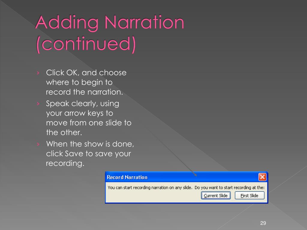 Adding Narration (continued) • Click OK, and choose where to begin to record the narration. • Speak clearly, using your arrow keys to move from one slide to the other. • When the show is done, click Save to save your recording.