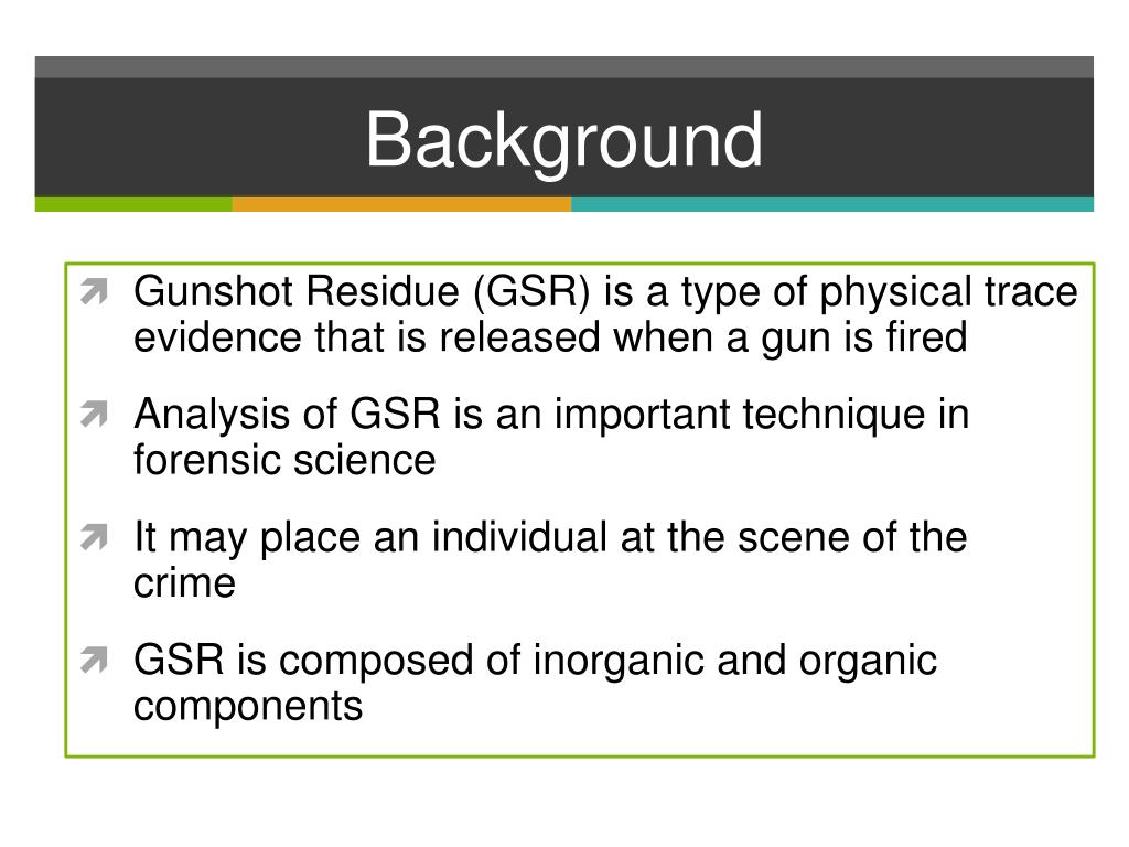 Background • Gunshot Residue (GSR) is a type of physical trace evidence that is released when a gun is fired • Analysis of GSR is an important technique in forensic science • It may place an individual at the scene of the crime • GSR is composed of inorganic and organic components
