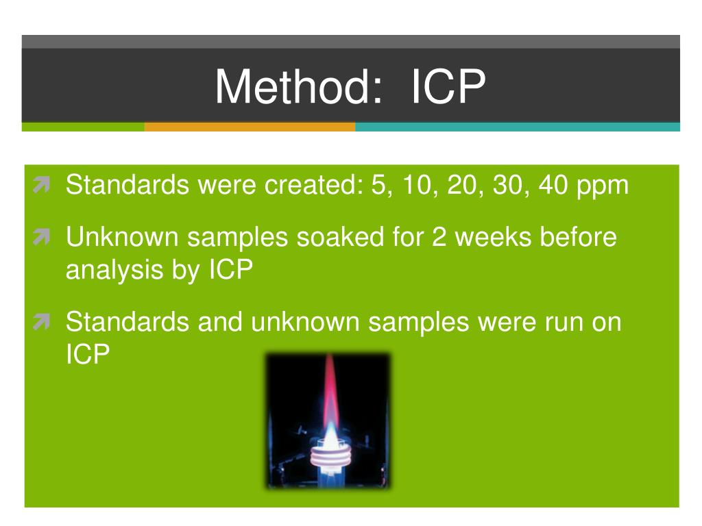 Method: ICP • Standards were created: 5, 10, 20, 30, 40 ppm • Unknown samples soaked for 2 weeks before analysis by ICP • Standards and unknown samples were run on ICP