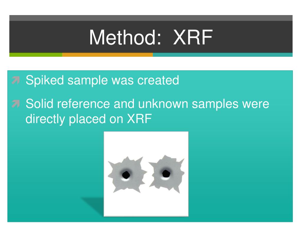 Method: XRF • Spiked sample was created • Solid reference and unknown samples were directly placed on XRF