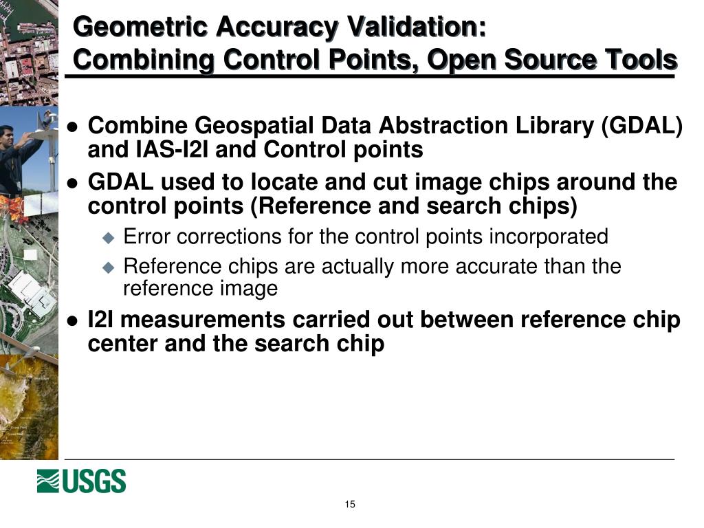 Geometric Accuracy Validation: Combining Control Points, Open Source Tools • Combine Geospatial Data Abstraction Library (GDAL) and IAS-I2I and Control points • GDAL used to locate and cut image chips around the control points (Reference and search chips) • Error corrections for the control points incorporated • Reference chips are actually more accurate than the reference image • I2I measurements carried out between reference chip center and the search chip