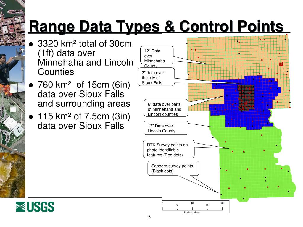 Sioux Falls Range • Orthoimagery covers Minnehaha and Lincoln counties • 85 km (53 miles) N-S • 54 km (34 mi) E-W • 30cm, 15cm, and 7.5cm(12in, 6in, & 3in) • LiDAR coverage at 1.4m posting • Orthoimagery and LiDAR data collected jointly by the USGS, Minnehaha and Lincoln Counties