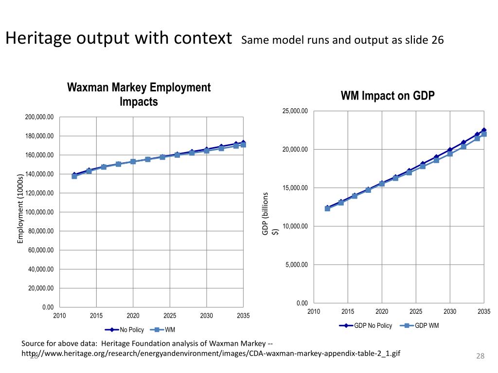 Heritage output with context Same model runs and output as slide 26 Employment (1000s) GDP (billions $) Source for above data: Heritage Foundation analysis of Waxman Markey -- http://www.heritage.org/research/energyandenvironment/images/CDA-waxman-markey-appendix-table-2_1.gif