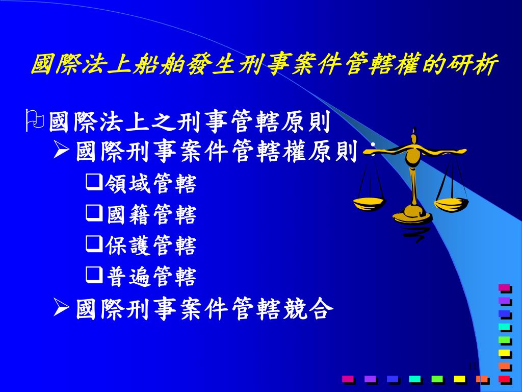 國際法上之刑事管轄原則 國際刑事案件管轄權原則: 領域管轄 國籍管轄 保護管轄 普遍管轄 國際刑事案件管轄競合 國際法上船舶發生刑事案件管轄權的研析