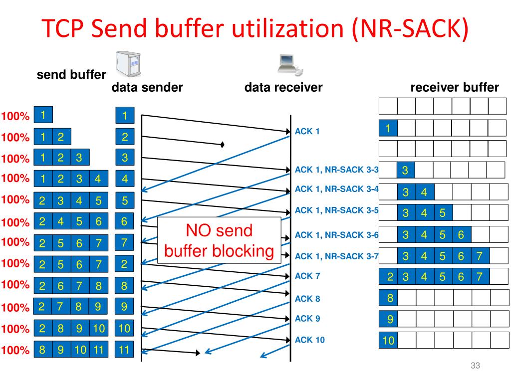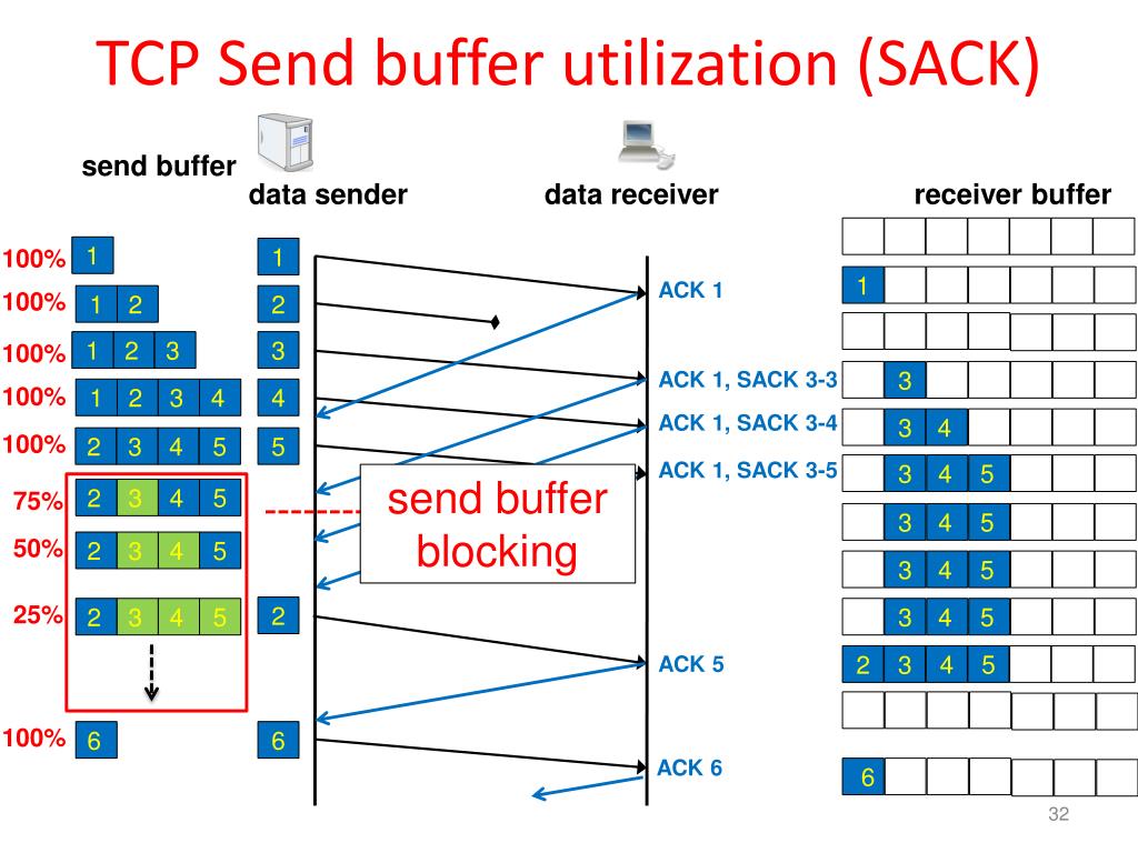 Transport layer receive buffer receiving application datasender receive buffer 3 4 5 7 9 11 12 13 ordered data (ACKed) Internet out-of-order data (SACKed) available space