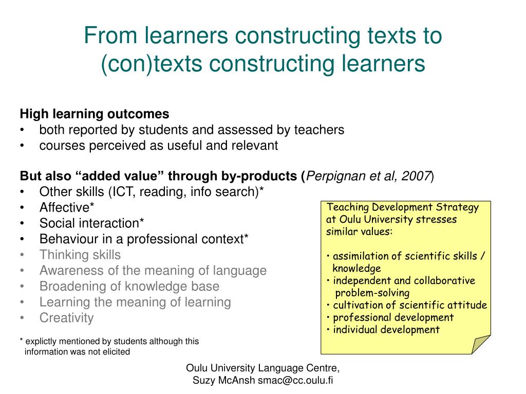 From learners constructing texts to (con)texts constructing learners High learning outcomes • both reported by students and assessed by teachers • courses perceived as useful and relevant But also “added value” through by-products (Perpignan et al, 2007) • Other skills (ICT, reading, info search)* • Affective* • Social interaction* • Behaviour in a professional context* • Thinking skills • Awareness of the meaning of language • Broadening of knowledge base • Learning the meaning of learning • Creativity * explictly mentioned by students although this information was not elicited • Teaching Development Strategy at Oulu University stresses • similar values: • assimilation of scientific skills / knowledge • independent and collaborative problem-solving • cultivation of scientific attitude • professional development • individual development Oulu University Language Centre, Suzy McAnsh smac@cc.oulu.fi