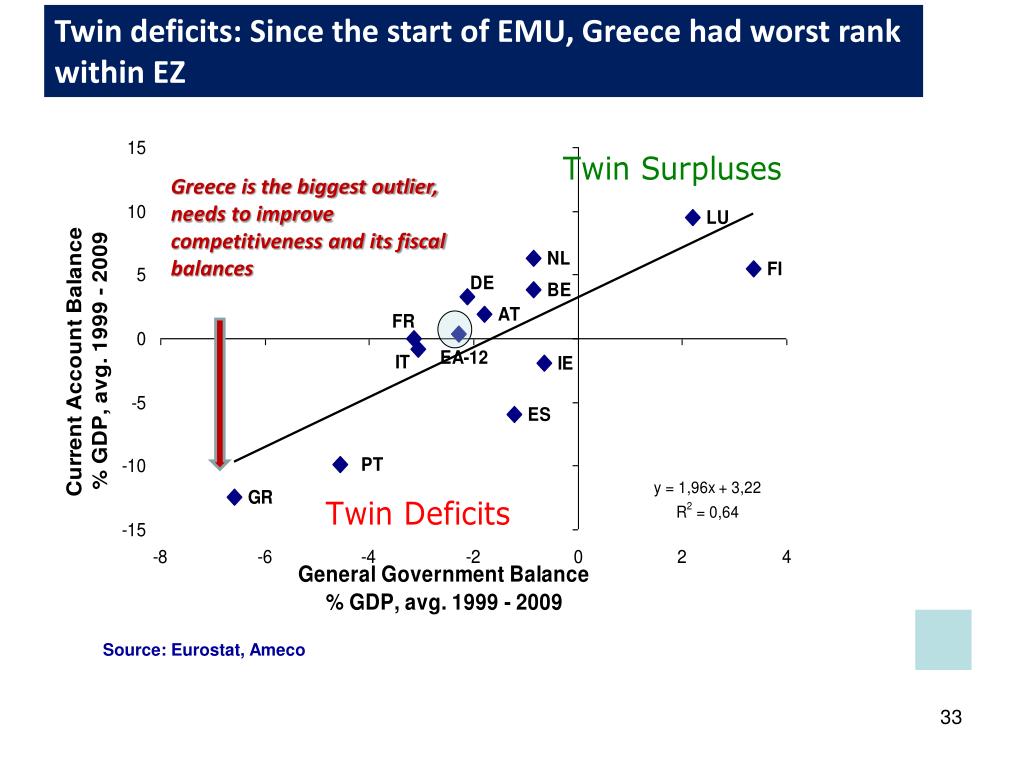 Twin deficits: Since the start of EMU, Greece had worst rank within EZ Greece is the biggest outlier, needs to improve competitiveness and its fiscal balances Source: Eurostat, Ameco