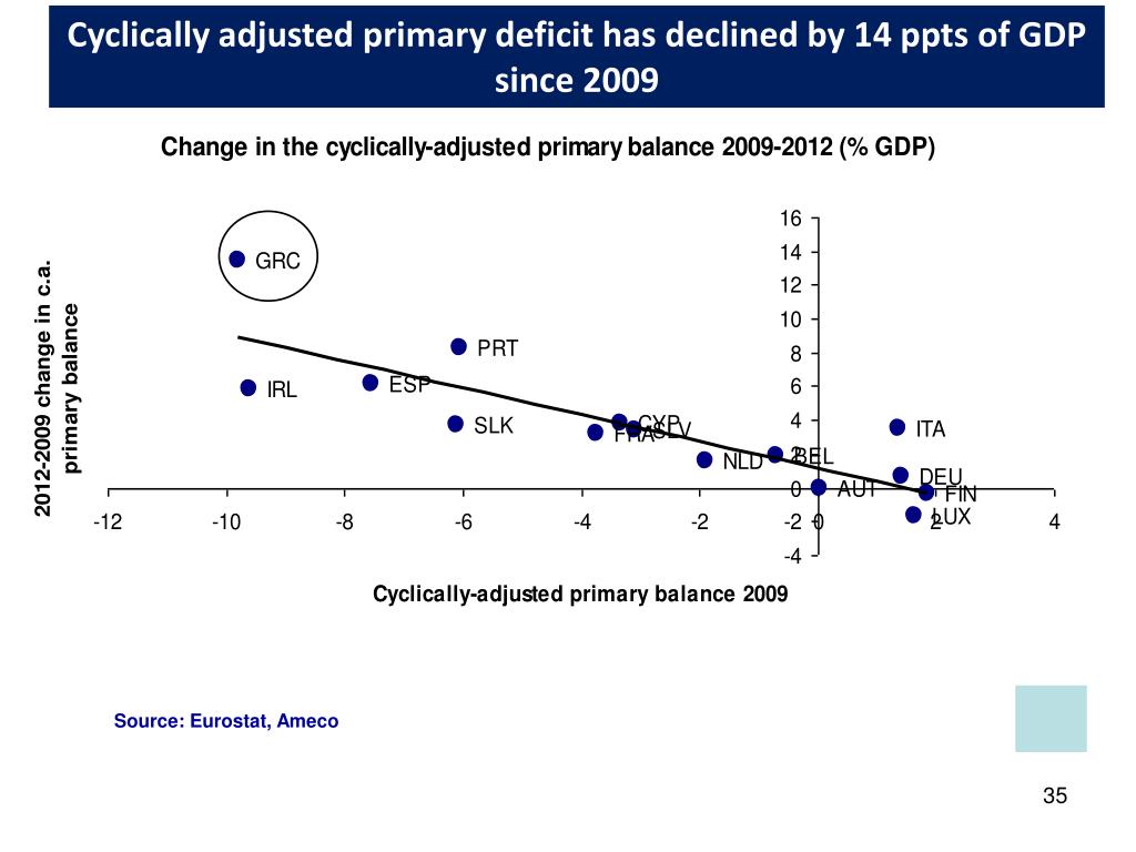 Cyclically adjusted primary deficit has declined by 14 ppts of GDP since 2009 Source: Eurostat, Ameco
