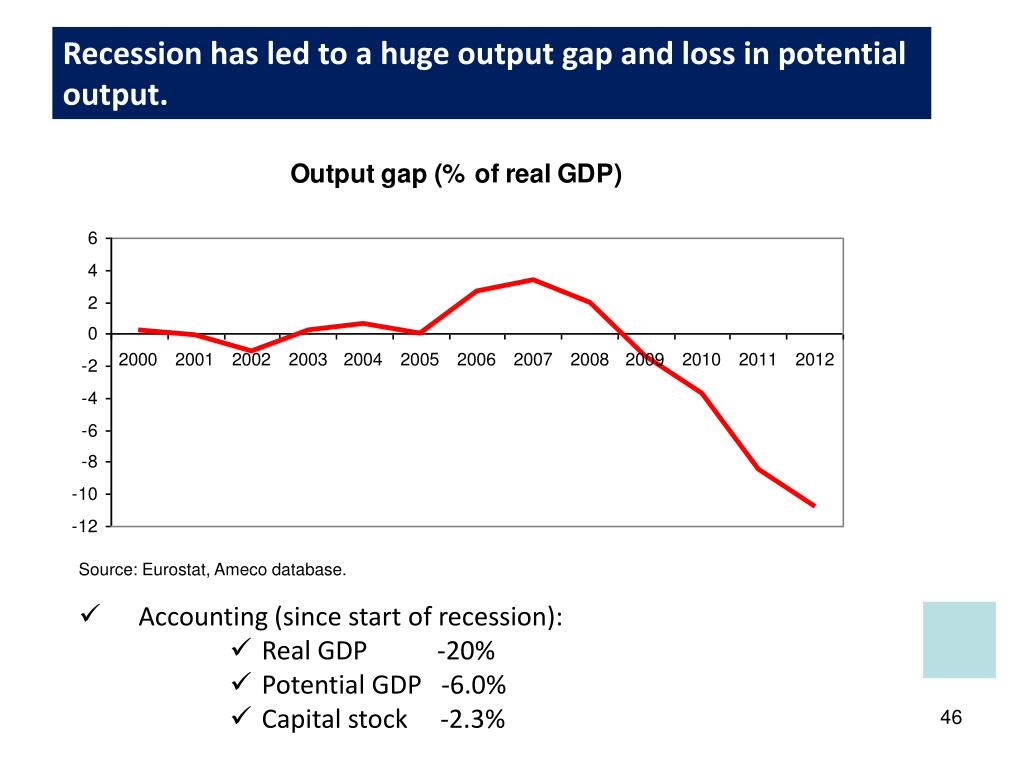 Recession has led to a huge output gap and loss in potential output. Source: Eurostat, Ameco database. • Accounting (since start of recession): • Real GDP -20% • Potential GDP -6.0% • Capital stock -2.3%