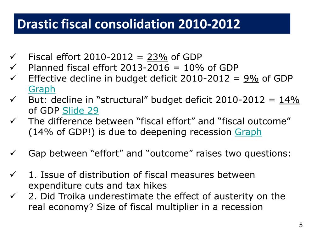 Troika’s original idea during 1st MoU • Fiscal consolidation: Negative effect on real economy – recession • Internal devaluation: Positive supply side effect – economic rebound (projected for 2012) Troika also counted on two secondary positive effects: • Crowding in (fatal mistake for an economy such as Greece as interest rate channel did not work) • Rebound in exports due to higher competitiveness