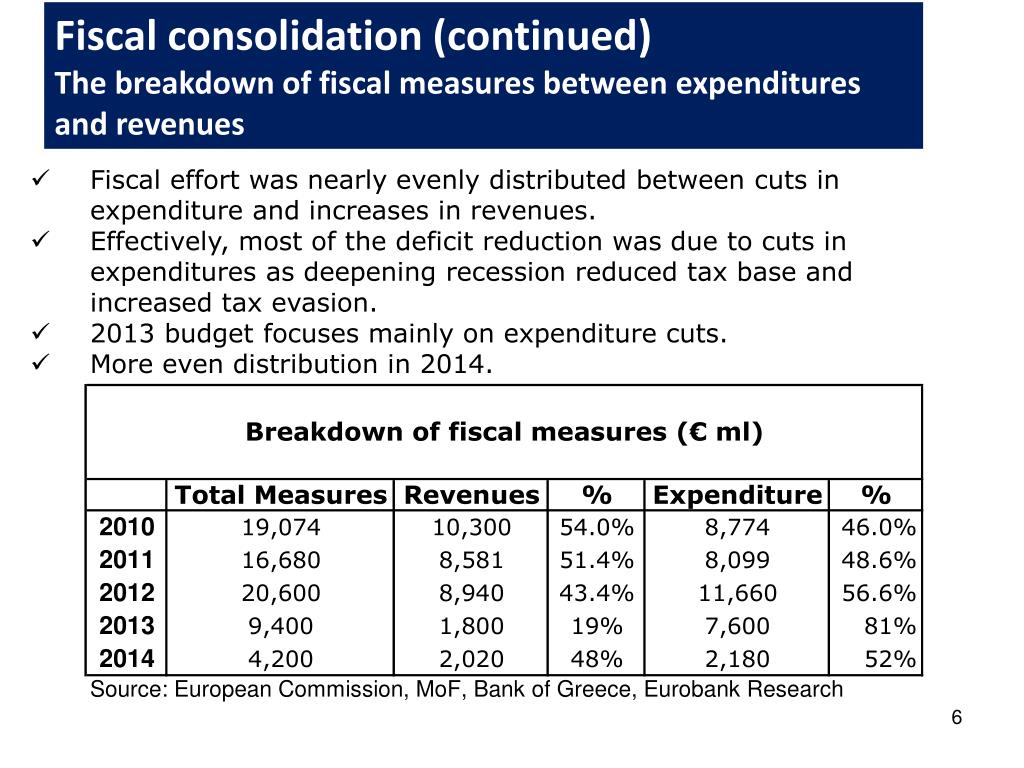 Fiscal consolidation (continued) The breakdown of fiscal measures between expenditures and revenues • Fiscal effort was nearly evenly distributed between cuts in expenditure and increases in revenues. • Effectively, most of the deficit reduction was due to cuts in expenditures as deepening recession reduced tax base and increased tax evasion. • 2013 budget focuses mainly on expenditure cuts. • More even distribution in 2014.