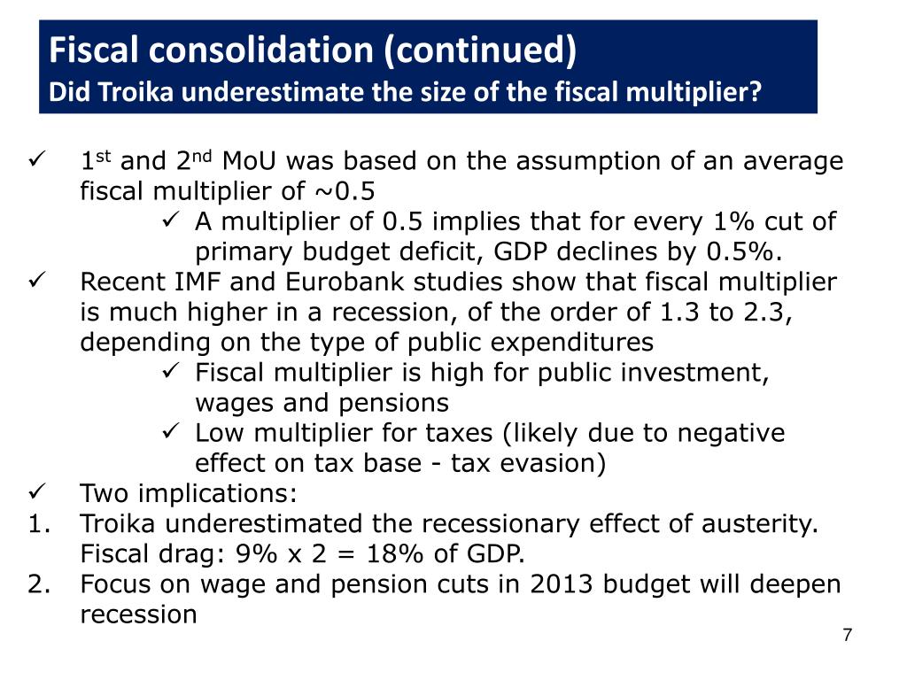 Fiscal consolidation (continued) Did Troika underestimate the size of the fiscal multiplier? • 1st and 2nd MoU was based on the assumption of an average fiscal multiplier of ~0.5 • A multiplier of 0.5 implies that for every 1% cut of primary budget deficit, GDP declines by 0.5%. • Recent IMF and Eurobank studies show that fiscal multiplier is much higher in a recession, of the order of 1.3 to 2.3, depending on the type of public expenditures • Fiscal multiplier is high for public investment, wages and pensions • Low multiplier for taxes (likely due to negative effect on tax base - tax evasion) • Two implications: • Troika underestimated the recessionary effect of austerity. Fiscal drag: 9% x 2 = 18% of GDP. • Focus on wage and pension cuts in 2013 budget will deepen recession