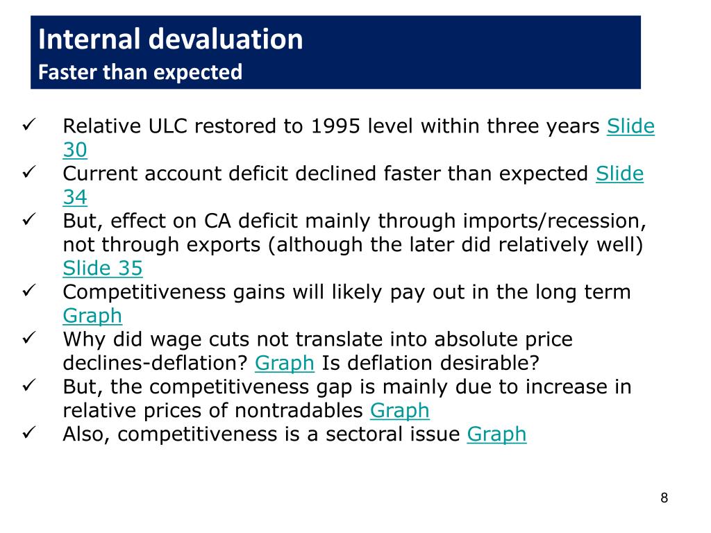 Internal devaluation Faster than expected • Relative ULC restored to 1995 level within three years Slide 30 • Current account deficit declined faster than expected Slide 34 • But, effect on CA deficit mainly through imports/recession, not through exports (although the later did relatively well) Slide 35 • Competitiveness gains will likely pay out in the long term Graph • Why did wage cuts not translate into absolute price declines-deflation? Graph Is deflation desirable? • But, the competitiveness gap is mainly due to increase in relative prices of nontradables Graph • Also, competitiveness is a sectoral issue Graph