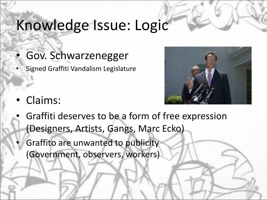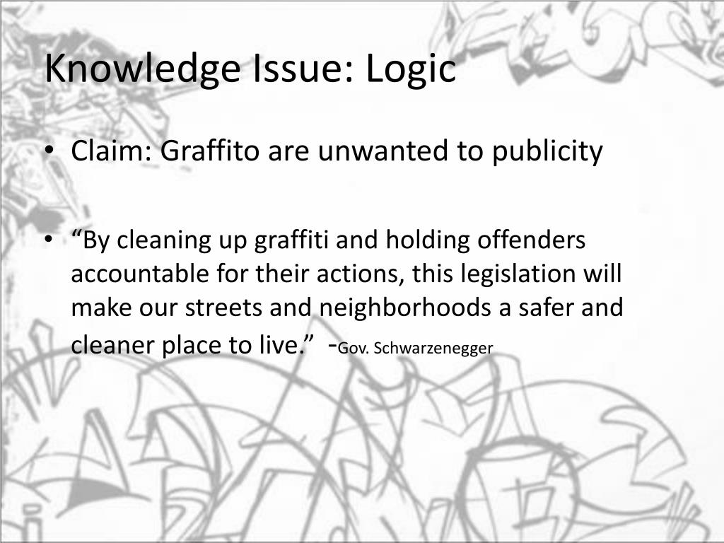 Knowledge Issue: Logic • Claim: Graffito are unwanted to publicity • “By cleaning up graffiti and holding offenders accountable for their actions, this legislation will make our streets and neighborhoods a safer and cleaner place to live.” -Gov. Schwarzenegger