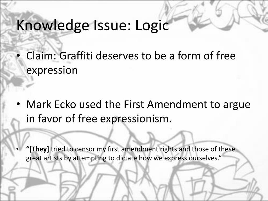 Knowledge Issue: Logic • Claim: Graffiti deserves to be a form of free expression • Mark Ecko used the First Amendment to argue in favor of free expressionism. • “[They] tried to censor my first amendment rights and those of these great artists by attempting to dictate how we express ourselves.”
