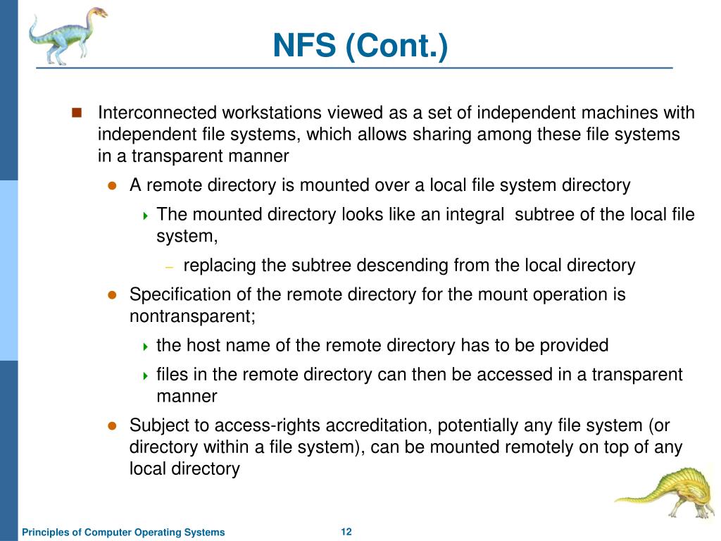 NFS (Cont.) • Interconnected workstations viewed as a set of independent machines with independent file systems, which allows sharing among these file systems in a transparent manner • A remote directory is mounted over a local file system directory • The mounted directory looks like an integral subtree of the local file system, • replacing the subtree descending from the local directory • Specification of the remote directory for the mount operation is nontransparent; • the host name of the remote directory has to be provided • files in the remote directory can then be accessed in a transparent manner • Subject to access-rights accreditation, potentially any file system (or directory within a file system), can be mounted remotely on top of any local directory
