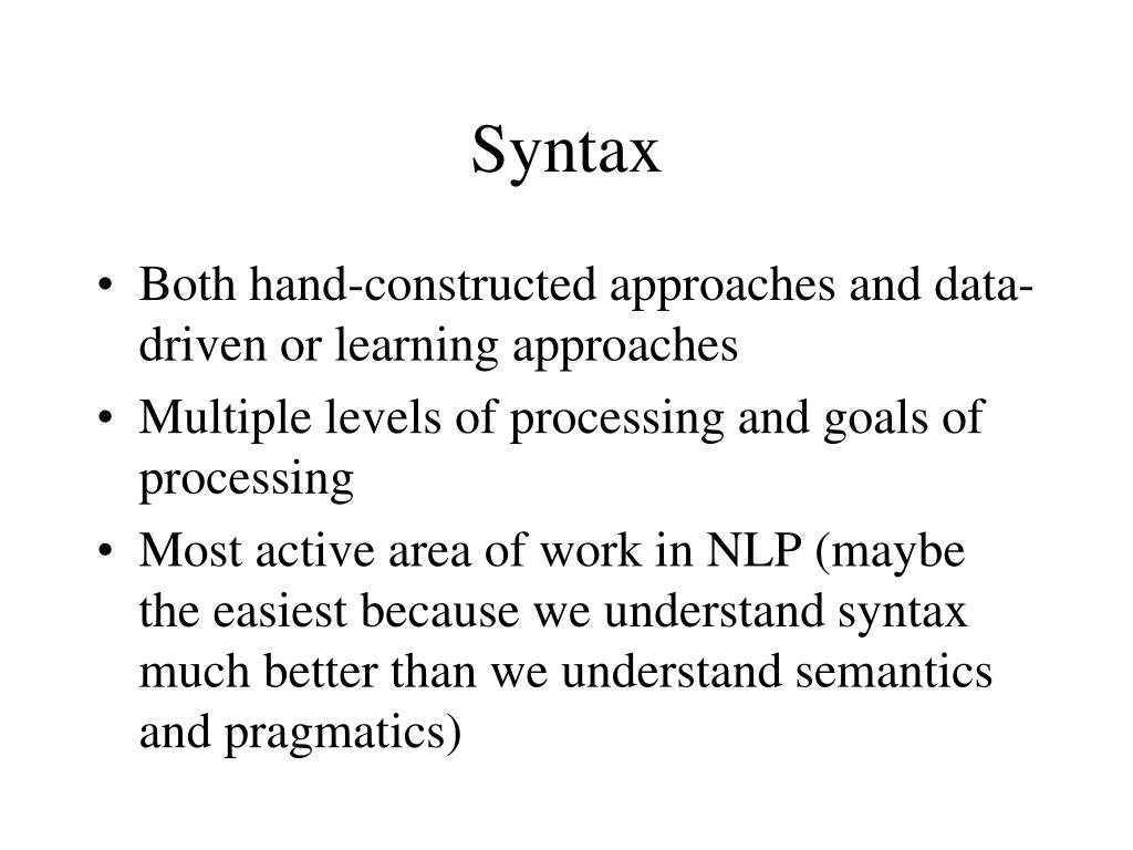 Syntax • Both hand-constructed approaches and data-driven or learning approaches • Multiple levels of processing and goals of processing • Most active area of work in NLP (maybe the easiest because we understand syntax much better than we understand semantics and pragmatics)