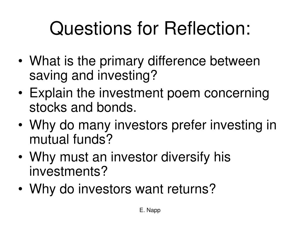 Questions for Reflection: • What is the primary difference between saving and investing? • Explain the investment poem concerning stocks and bonds. • Why do many investors prefer investing in mutual funds? • Why must an investor diversify his investments? • Why do investors want returns? E. Napp